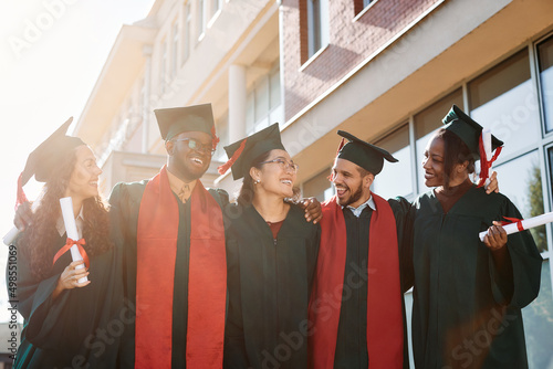 Group of cheerful multiracial students have fun after graduation ceremony.