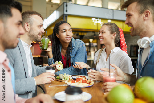 Group of cheerful young multi-ethnic students in casual clothing sitting at table on food court and having lunch together
