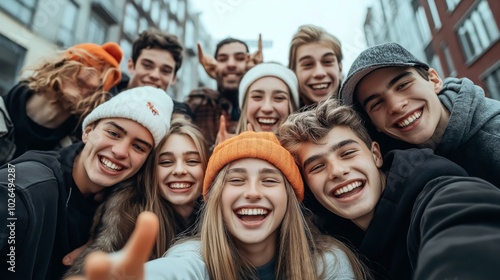 Group of cheerful young people taking a selfie outdoors with urban buildings in the background, all wearing casual winter clothing and beanies.