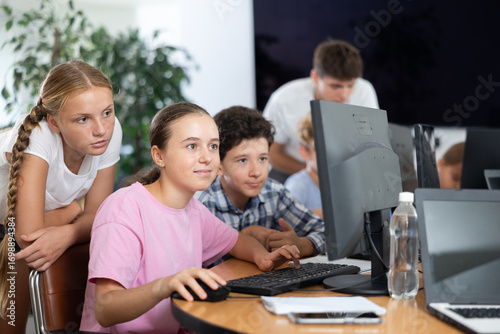 male, boy, girl, female, youth, children, children, childhood, caucasian, european, class, lesson, instructing, teacher, learn, training, group, explaining, computer, course, learning, using, studies, contented, cyberspace, use, technology, beginner, desk, teamwork, trainer, indoor, instructor, work, classroom, school, education, elementary, science, lecture