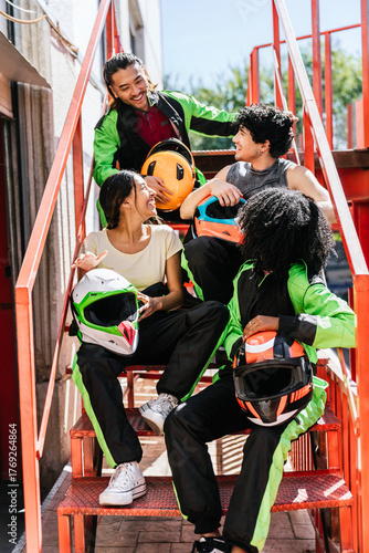 Group of diverse friends taking a break on stairs, holding helmets and smiling after a fun go karting session