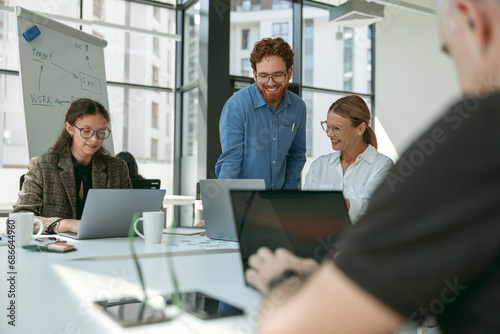 Group of diverse people discussing new project in office meeting room. Business teamwork situation