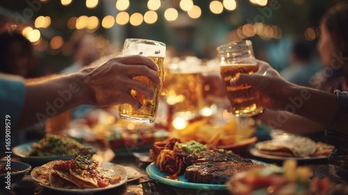 Group of diverse people enjoying a lively outdoor dinner party with drinks and delicious food on a festive evening