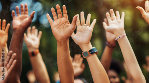 Group of diverse raised hands outdoors symbolizing unity and participation