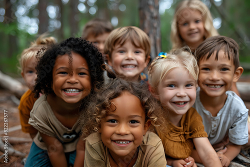 Group of diverse, smiling children playing outdoors, capturing joy and friendship. Ideal for educational materials, community projects, and family-oriented promotions.