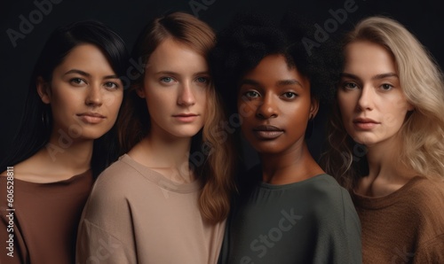 Group of diverse women standing together against brown background, Multi ethnic females looking at camera in studio, generative AI