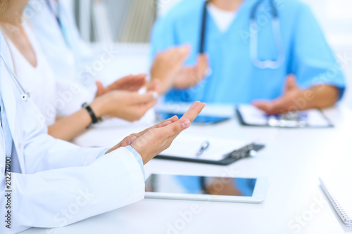 Group of doctors applauding at medical meeting. Close up of physician hands. Teamwork in medicine