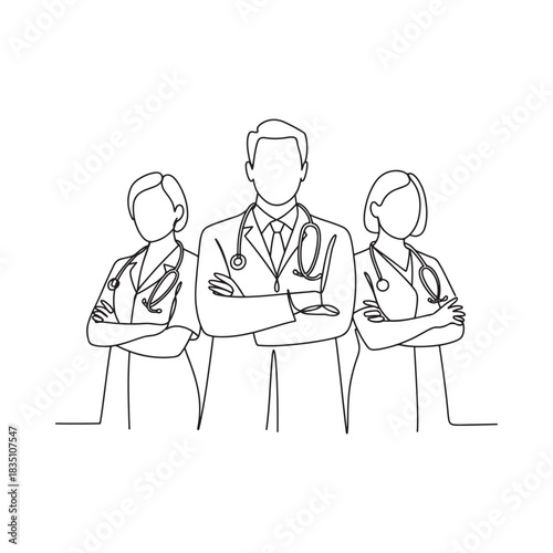 doctor, nurse, medicals, health care, teamwork, line art, vector, illustration, professional, group, people, standing, arms crossed, hospital, clinic, health, medicine, care, uniform, stethoscope, team, artwork, drawing, vignetting, simple, minimal, isolated, high-quality, professional, contour, outline, physician, nurse, staff, men at work, front view, career, job, occupation, treatment, well-being, expert, specialist