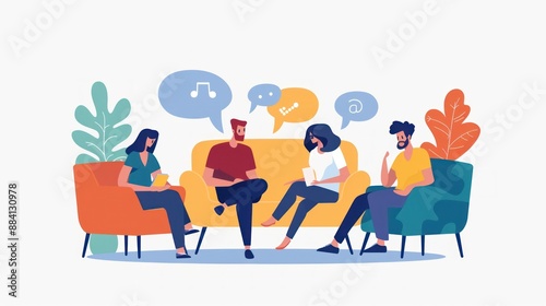 people, friends, conversation, sitting, group, chatting, relaxation, social, gathering, couch, chair, illustration, cartoon, graphic, design, digital, art, communication, interaction, togetherness, casual attire, relaxed, happy, friendly, smiling, laughing, fun, joy, positive, colourful, bright, vibrant, white, background, indoor, modern, contemporary, simple, clean