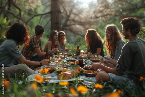 Group of Friends Enjoying an Afternoon Picnic in a Forest