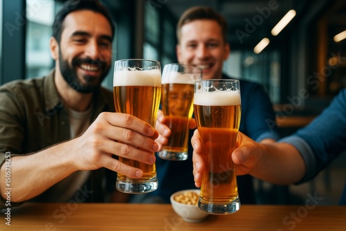 Group of friends enjoying beer together in a bar with warm lighting and modern background celebrating friendship and leisure time concept.