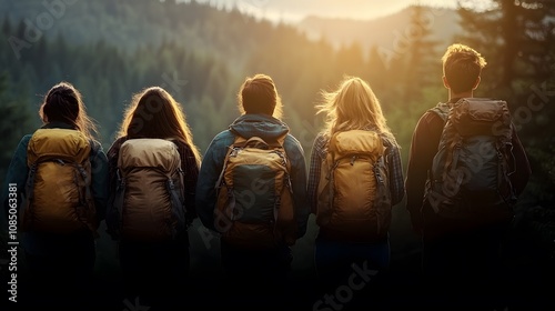 Group of friends hiking a scenic mountain trail, wearing colorful outdoor gear, surrounded by lush green trees and a clear sky, adventurous and active mood