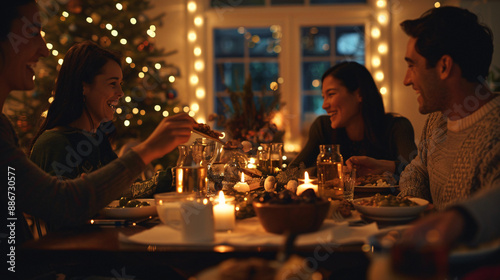group, friends, laughing, sharing, dish, during, festive, dinner, party, warmly, lit, dining, room