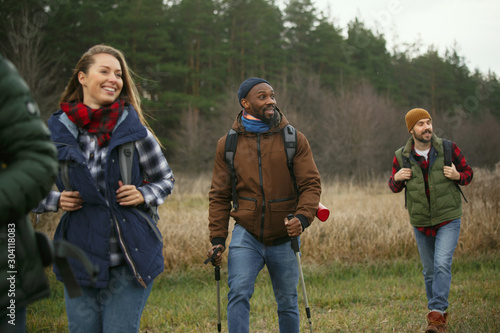 Group of friends on a camping or hiking trip in autumn day. Men and women with touristic backpacks going throught the forest, talking, laughting. Leisure activity, friendship, weekend.