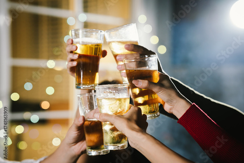 Group of friends raising glasses of beer together in a cheerful toast, celebrating with bright bokeh lights in the background.