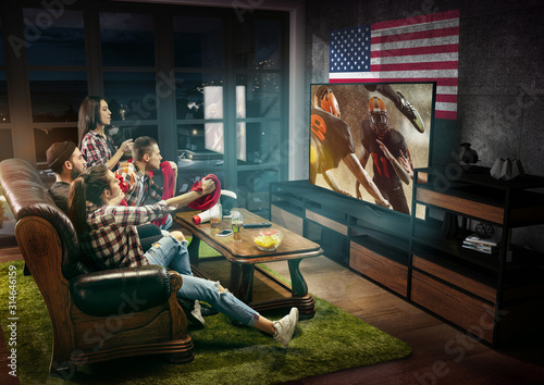 Group of friends watching TV, american football match, championship. Emotional men and women cheering for favourite team, look on fighting for ball. Concept of friendship, sport, competition, emotions