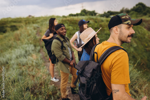 Group of friends, young men and women walking, strolling together outskirts of city, in summer forest, meadow. Active lifestyle, friendship, care, ecology concept