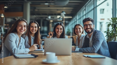 Group of happy business coworkers having video call over laptop in empty conference hall : Generative AI