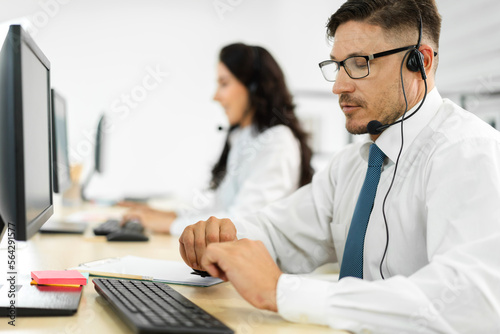 Group of happy call center smiling business operator customer help support team phone services agen working and talking with headset on desktop computer at call center office