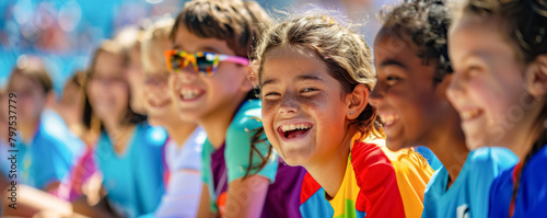 Group of happy children watching together a sports event in the stadium