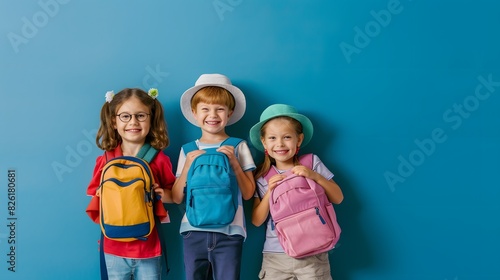 children, back to school, smiling, backpack, friends, school, ready, group, happy, colourful, blue background, education, student, elementary school, learning, children, fun, cheerful, school supplies, hat, elementary school, youth, diverse, classmate, children, girl, boy, playing, minimalist, academic, pupil, joyful, preparation, innocence, day care, academic year, celebration