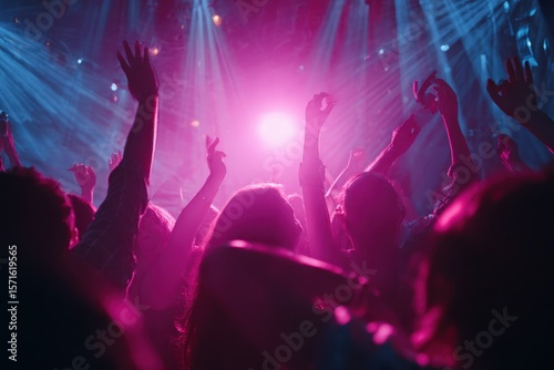 Group of happy people enjoying a vibrant night at a DJ event surrounded by colorful lights and energetic atmosphere