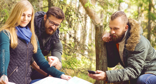 Group of happy, young friends checking a map in forest. Camp, tourism, hiking, trip, concept.