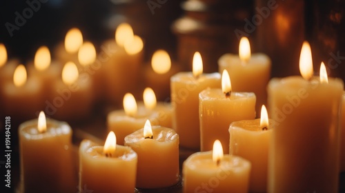 Group of illuminated candles burning with warm glow. Symbol of hope, remembrance, faith and prayer. For funeral, memorial, Advent.
