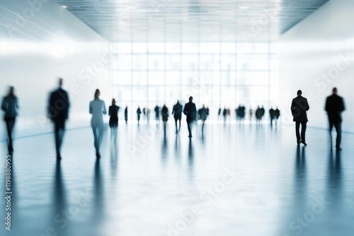 Group of individuals walking together in a large room, possibly for a meeting or conference