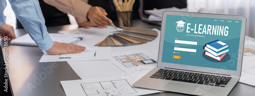 Group of interior architect designer discussing together on blueprint and laptop screen display architecture software for more precise designing layout. Modern home design and renovation. Insight