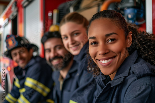 Group of interracial firefighters, women and men ready to be heroes and fight fires with their fire truck