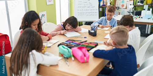 group, children, childhood, children, girl, boy, people, children, friends, adorable, lifestyle, expression, sitting, table, relaxing, comfortable, comfort, using, sunlight, student, education, study, studying, student, together, write, writing, draw, drawing, notebook, paper, book, learning, learn, serious, condensed, focused, room, kindergarten, playroom, classroom, school, background, indoor, interior, indoor, college