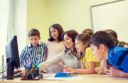group of kids with teacher and computer at school