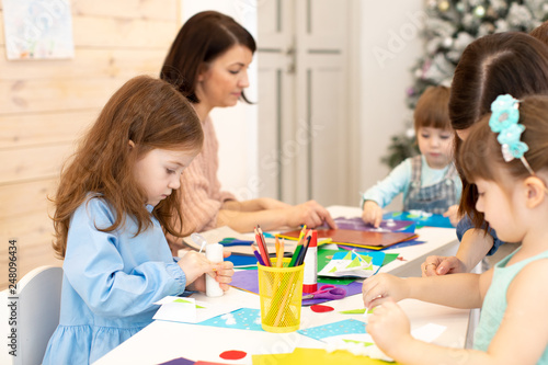 Group of kindergarten children at daycare. Preschool children working with color paper, sciccors and glue on art class in classroom