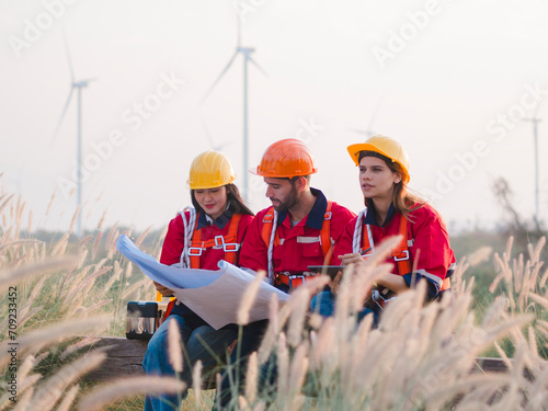 Group of maintenance engineers preparing and planning inspection of wind turbines, holding tablets, looking at wind turbines