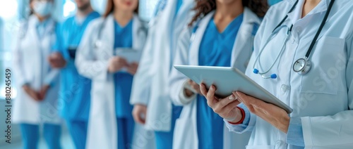 doctor, nurse, medicals, health care, hospital, teamwork, professional, group, collaboration, uniform, stethoscope, white coat, tablet, digital, technology, blue, white, standing, serious, focused, dedicated, care, health, treatment, medicine, patient, diagnosis, research, clinical, professionalism, expertise, trust, compassion, community, hospitality, well-being, recovery, support, together, progress