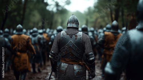 Group of medieval knights in armor gathering in a forest setting, with a focus on one knight in the foreground, showing their metal armor and helmets during a historical reenactment event.