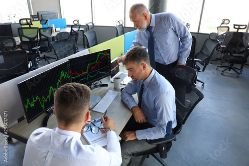 Group of modern business men in formalwear analyzing stock market data while working in the office.