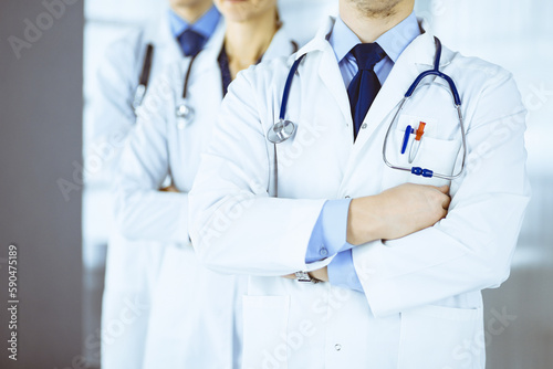 Group of modern doctors standing as a team with crossed arms and stethoscopes in hospital office. Physicians ready to examine and help patients. Medical help, insurance in health care
