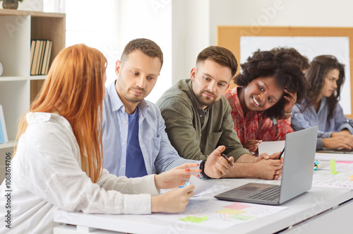 Group of multiracial colleagues sitting together at desk with laptop working together on collaborative project. Diverse company employees discussing work tasks preparing group project or presentation.