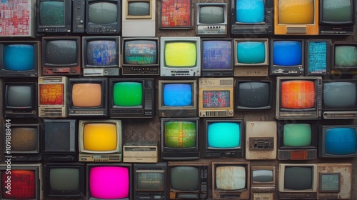 group of old televisions with colored screens