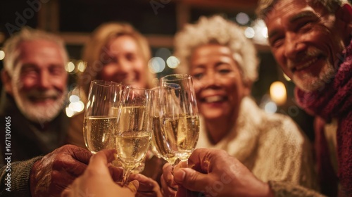 group of older happy friends toasting with champagne during new years eve no logos no brands ar 169