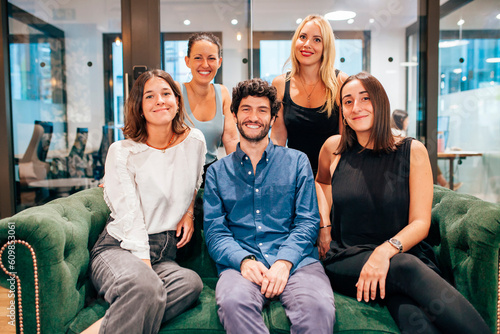 colleague, co-worker, group, startup, team, puckered, together, happy, cheerful, professional, young, creative, modern, smile, contemporary, workspace, success, ambition, partner, sitting, couch, sofa, student, oneness, multiracial, ethnic, businessperson, friends, human relationships, people, meeting, lifestyle, smart, friendship, joy, positive, diverse, 5, content, entrepreneur, business, optimist, friendly, indoor, blurred background, horizontal