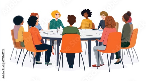 people, group, table, round, meeting, discussion, diverse, chair, sitting, communication, collaboration, team, workplace, office, conversation, sharing, idea, interaction, social, gathering, together, oneness, multi-ethnic, inclusion, community, togetherness, friendship, human relationships, partnership, female, male, adult, human, illustration, cartoon, design, graphic, art