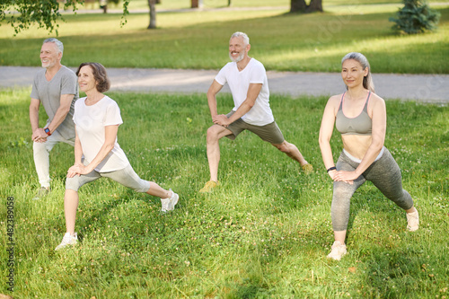 park, summer, greenery, people, community, mature, caucasian, fit, healthy lifestyle, wellness, well-being, weekend, activewear, active, energetic, fitness, adult, exercising, physical exercise, instructor, coach, sport, activity, lunge, grass