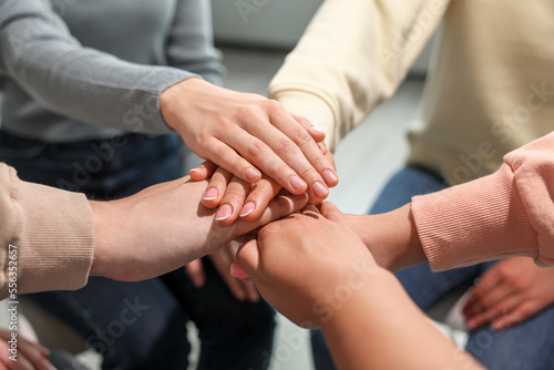Group of people holding hands together indoors, closeup. Unity concept
