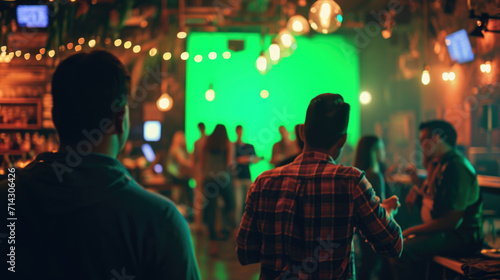 bar, television, people, watching, group, friends, gathering, event, live, broadcast, screen, green, pub, social, engagement, entertainment, night, indoor, chroma, key, man, woman, audience, attention, focused, communal, leisure, recreation, evening, casual attire, lifestyle, socialising, excitement, anticipation, spectator, interaction, digital, display, modern, communication