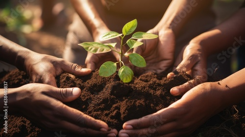 group of people planting a tree, group of hands - reforestation concept (Generative AI)