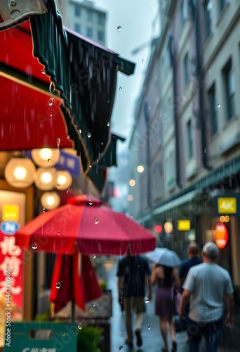 street, rainy day, umbrella, people, walking, city life, rainstorm, misty, water droplets, awning, urban, commuter, weather, rainy weather
