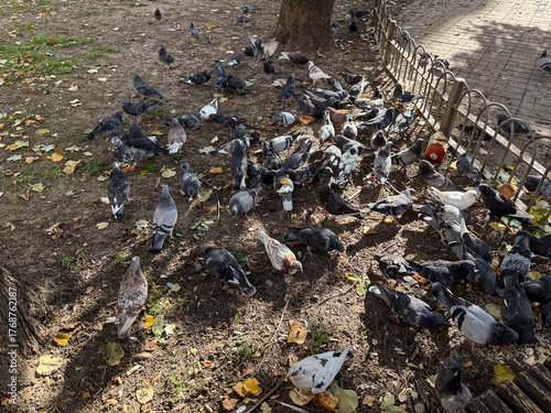 pigeon, bird, flock, feeding, ecology, park, city, tree, ground, nature, wildlife, bread, seed, sunlight, leaf, dirt, feather, beak, wing, environment, group, shadow, behaviour, community, coexistence, animal, habit, detail, species, harmony, motion, perspective, interaction, urban, pattern, natural, daily, surface, observation, social, gathering, landscape, diversity, relation, life, balance, routine